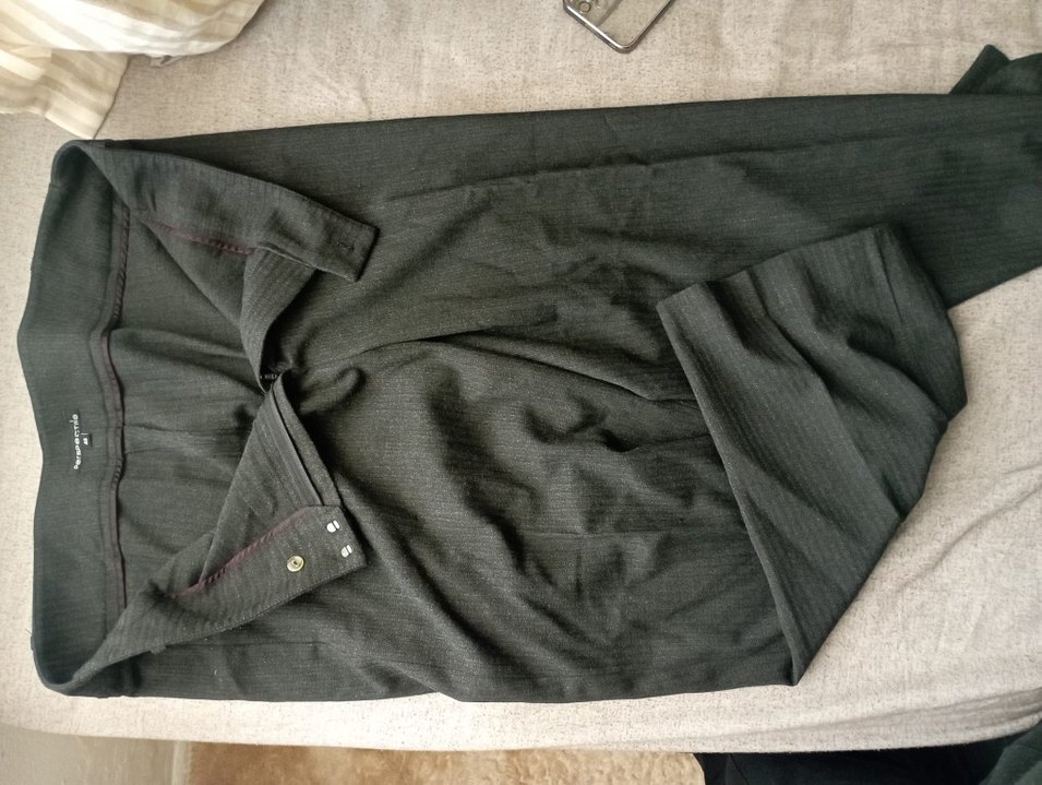 Gri renkte, düğmeli ve uzun kesim pantolon. Yumuşak keten kumaştan üretilmiş, rahat ve sade iş tarzına uygun.