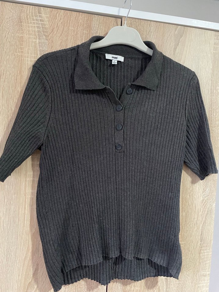 Düğmeli ön kısmı, polo yaka ve kısa kollu, vücuda oturan gri kadın kazak. gündelik sokak stiline uygundur.