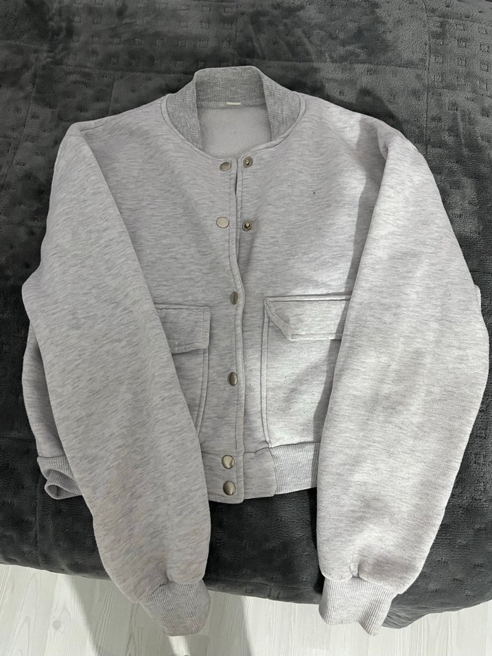 Gri renkli, düğmeli, uzun kollu, yuvarlak yakalı, cep detaylı, rahat kesim kadın ceket. Yumuşak ve sıcak kumaştan üretilmiştir, günlük sokak stili için uygundur.
