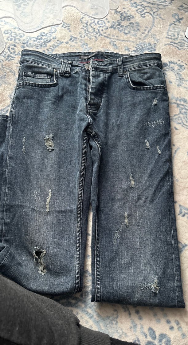 Gri renkte, düğmeli ve rahat kesim erkek kot pantolon. Normal boyda, denim kumaştan ve hafif yıpranmış detaylara sahip, günlük kullanıma uygun.