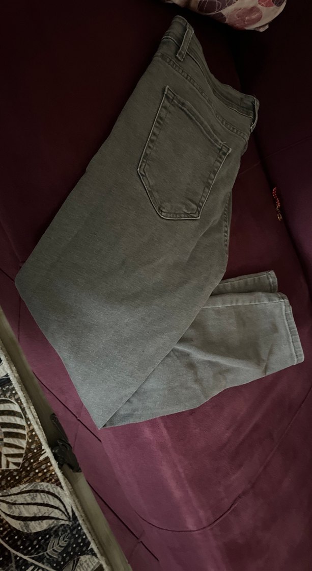 Düğmeli, gri renkte, rahat kesim denim kot pantolon. Midi boyda, desen içermeyen ve günlük kullanıma uygun sokak stilinde bir model.