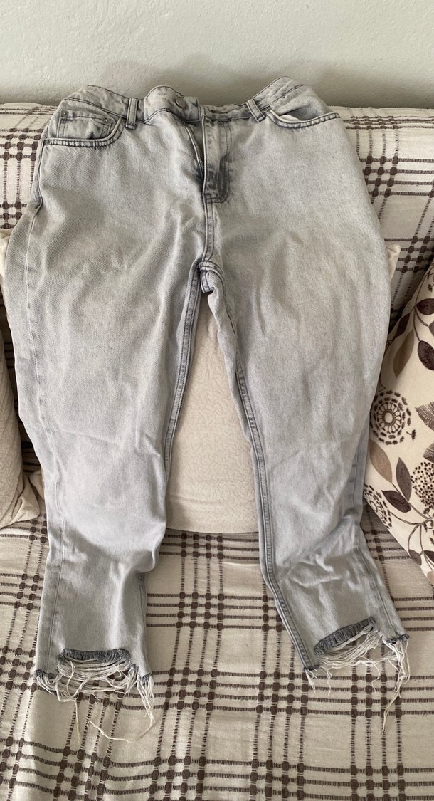 Gri renkte, düğmeli ve yıpranmış paçalı rahat kesim kadın kot pantolon. Günlük sokak stili için uygundur ve desensizdir.