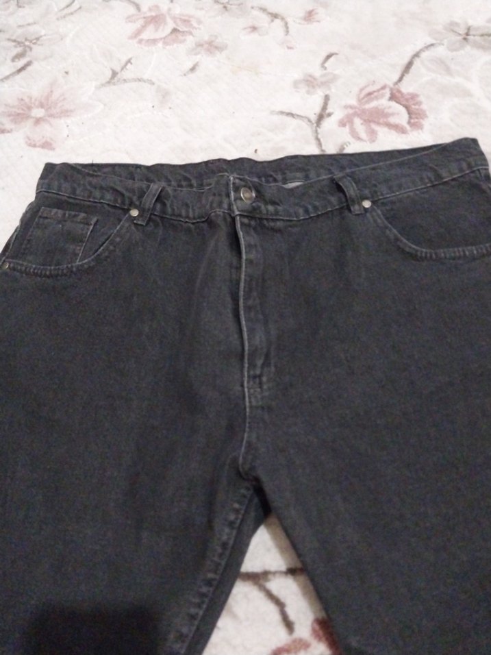 Gri denim kumaştan, düğmeli ve rahat kesim kadın kot pantolon, günlük kullanıma uygun normcore tarzında.
