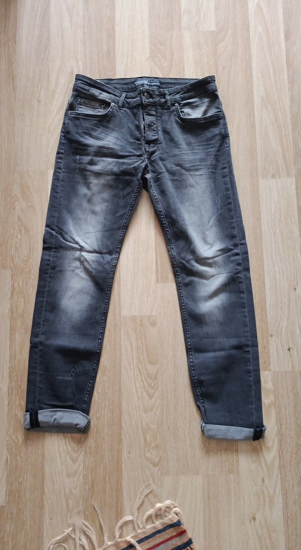 Gri renkte, düğmeli kapamalı, regular fit kesim erkek kot pantolon. Dayanıklı denim kumaştan olup günlük ve sokak stiline uygundur.Sorunsuz.