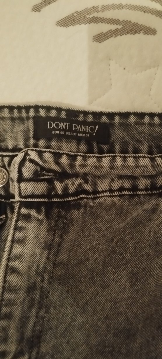 Gri düğmeli, bol kesim kadın jean. Rock punk tarzında, baskılı detaylara sahip, günlük kullanım için uygun. Etiket üzerinde 'DONT PANIC' yazıyor.