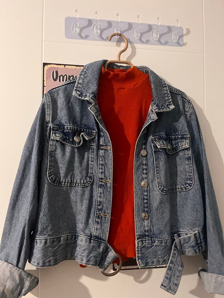 Düğmeli, cep detaylı gri denim ceket. Salaş kesim, yüksek yakalı ve askılı kollu, kırmızı iç katmanla kombinlenmiş. Günlük rahat stil için uygun.