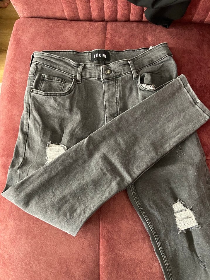 Gri renkte, düğmeli ve salaş kesimli erkek denim pantolon. Normal midi boyunda, günlük kullanıma uygun sade yırtık detaylı rahat bir modeldir.