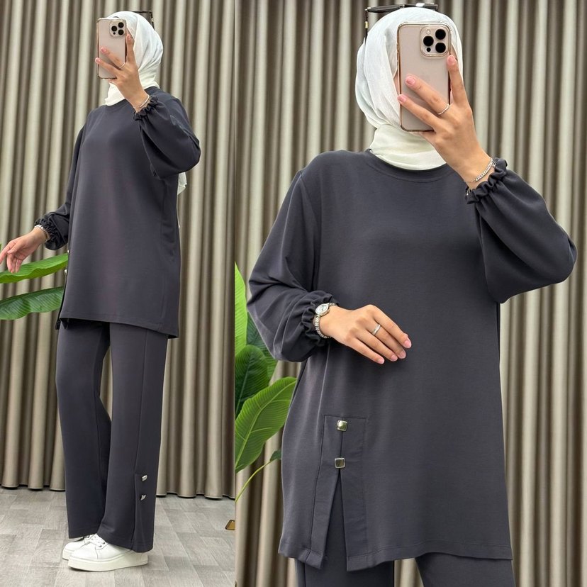 Salaş kesim, uzun gri kadın takımı, düğme detaylı, uzun kollu ve bisiklet yaka. Kristal kumaştan, sokak stili ve günlük kullanım için uygun. Sipariş vermeden önce beden bilgisi belirtiniz.
