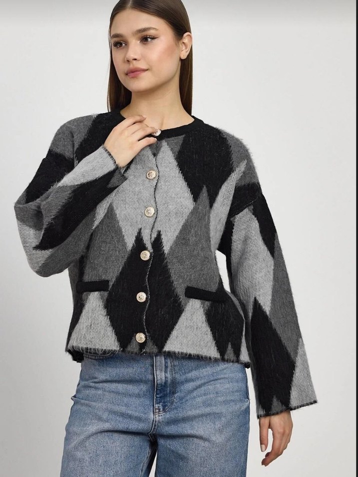 Gri Düğmeli Salaş Triko Hırka