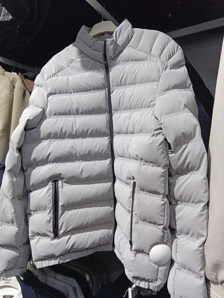 Bu gri, düğmeli sokak stili erkek montu, dar kesim, bisiklet yaka ve uzun kolludur. Normal midi boyda, sentetik kumaştan üretilmiştir.