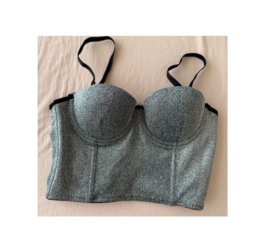 Düğmeli, askılı kolları olan, sentetik kumaştan yapılmış gri, vücuda oturan bustiyer. Cesur sokak stili için uygun. ✨