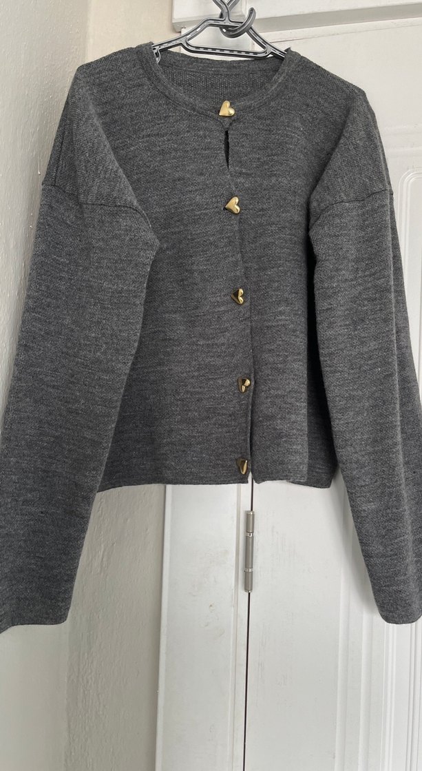 Gri triko, düğmeli ve kalp şeklinde düğmelerle süslenmiş bir kadın hırkasıdır. Notlu yaka ve uzun kolludur, rahat ve sade tarz sunar.