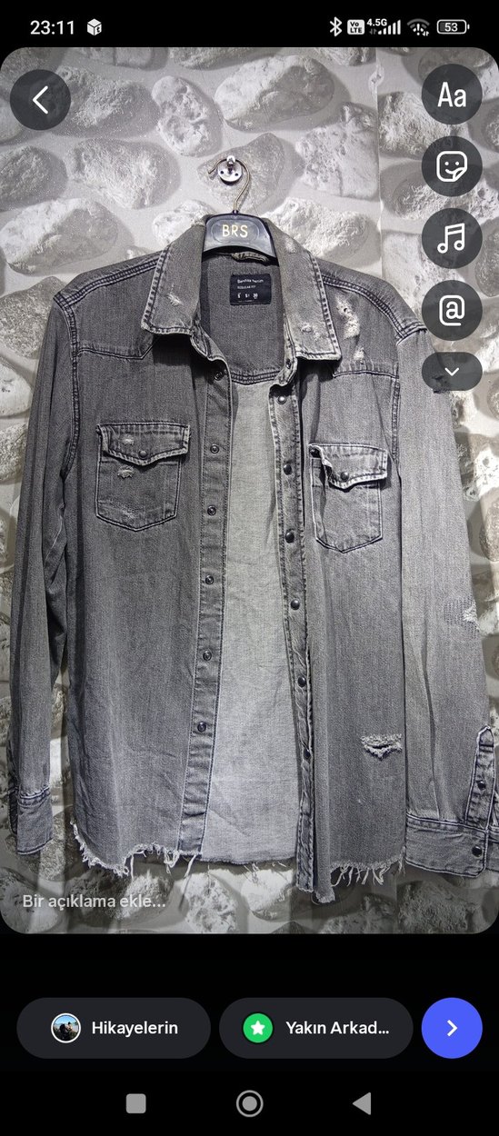 Gri düğmeli, uzun kollu, bol kesim denim ceket. Notlu yaka ve midi boy. Grunge punk tarzını yansıtır. Günlük kullanıma uygun.