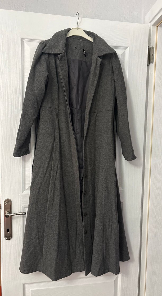 Düğmeli, gri uzun hamile kabanı, kesik yaka ve uzun kolludur. Yumuşak keten kumaştan yapılmış, rahat kesim ve sade tasarıma sahiptir.