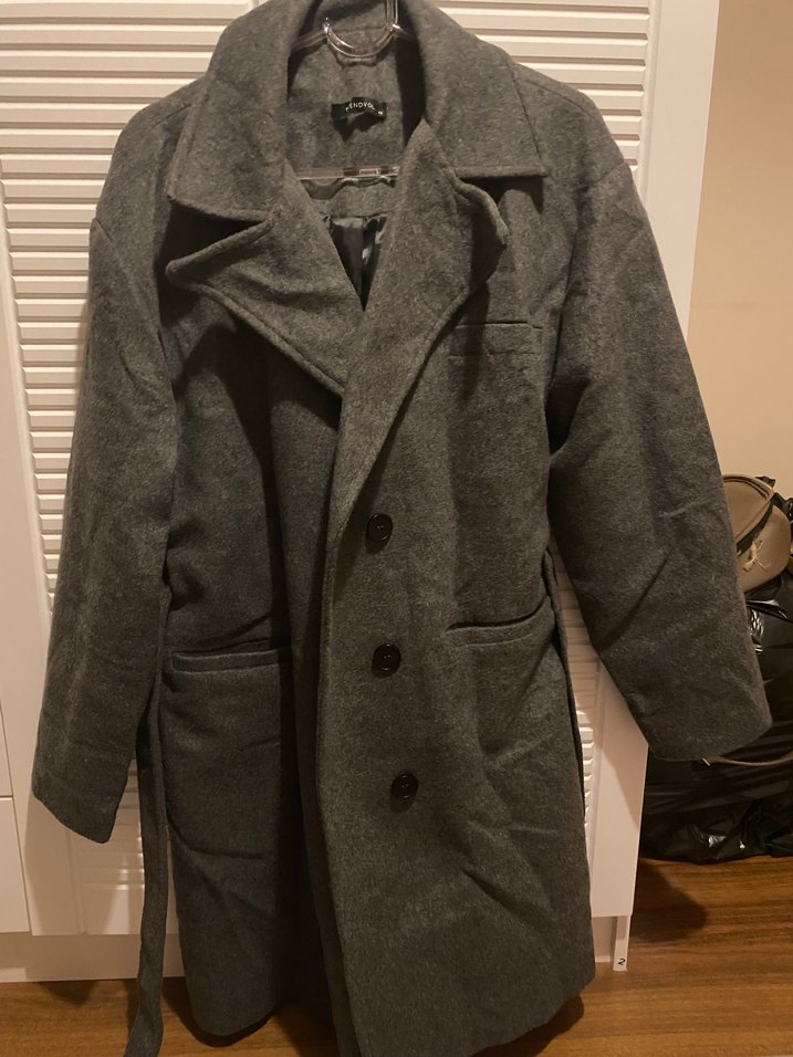 Geniş yakalı, düğmeli ve iki cepli gri uzun kaban, yumuşak ve sıcak kumaştan üretilmiştir.
