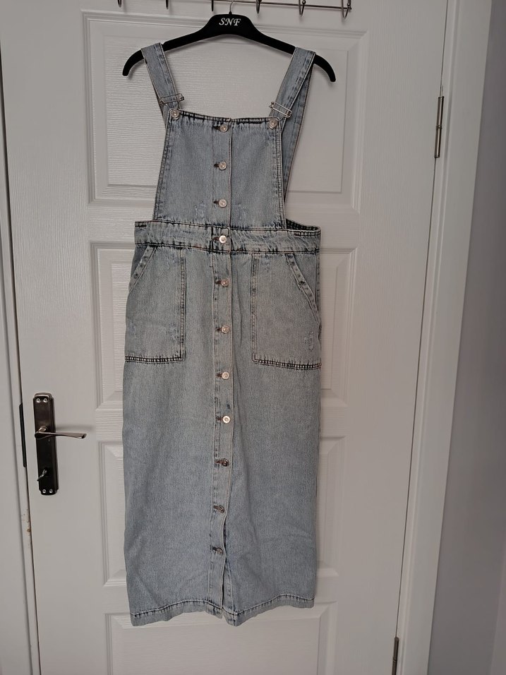 Gri düğmeli, kolsuz uzun denim tulum, bol kesim, bisiklet yaka ve ön ceplerle günlük rahat kullanım için uygun.