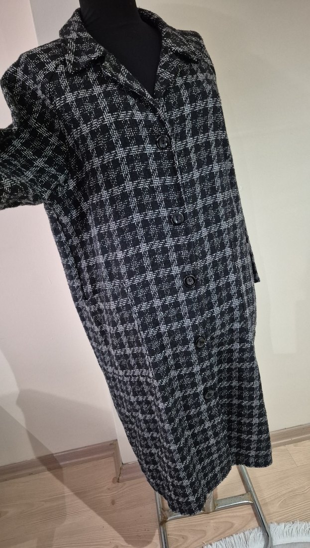 Düğmeli, uzun kolları ve kruvaze yaka detayı olan, sentetik kumaştan gri kadın kaban. Rahat kesimi ve sokak stili ile günlük kullanıma uygun.