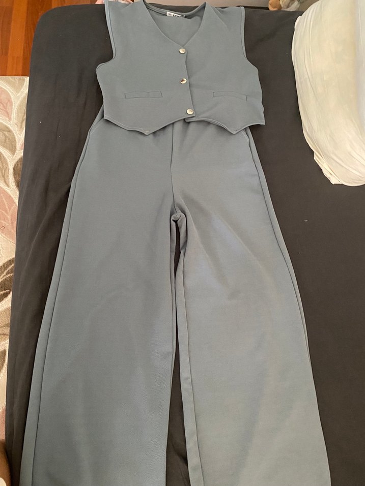 Gri renkte, düğmeli, kolsuz yelek ve uzun pantolondan oluşan kadın takımı. Sentetik kumaştan, regular fit ve ofis kullanımı için uygundur.