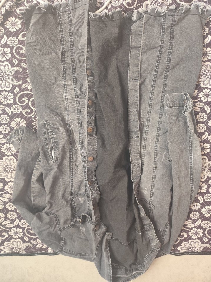 Gri kot ceket, uzun kesim ve bol kalıpla düğmeli, yaka detaylıdır. ve bohem tarzda, günlük kullanıma uygundur.