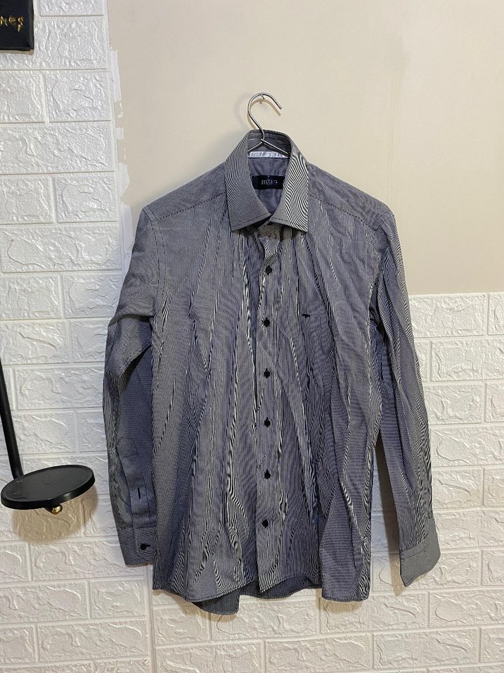 Düğmeli, uzun kollu, gri erkek gömlek. Normal kesim ve kesik yaka. Sentetik kumaştan, iş ve günlük kullanım için uygun.