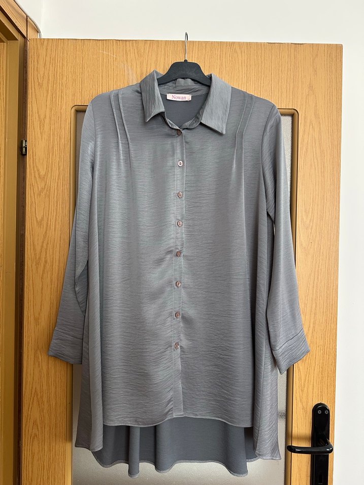 Gri gömlek, düğmeli ve uzun kolludur. Notlu yaka ve midi boyuyla rahat, bol kesim sunar. Ofis için uygundur.