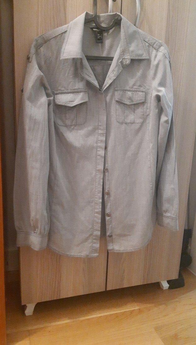 Gri keten kumaştan, uzun kollu, düğmeli ve cepli kadın gömleği. Notlu yaka ve normal kesimle günlük sokak stiline uygun.