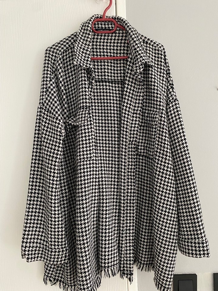 Gri renkli, düğmeli uzun kollu kadın gömlek, kazayağı desenlidir. Notlu yaka ve normal kesime sahiptir. Günlük sokak modasına uygun, tekstil kumaştan üretilmiştir. İki düğmesi eksik sadece bi kolunda bi önde