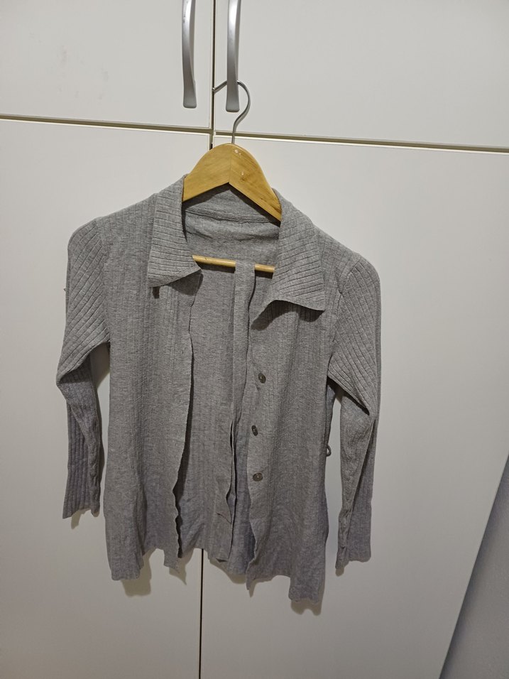 Gri oluklu kumaştan, düğmeli ve uzun kollu, yakası kesimli kadın hırka. Rahat ve midi boy, gündelik kullanıma uygundur.