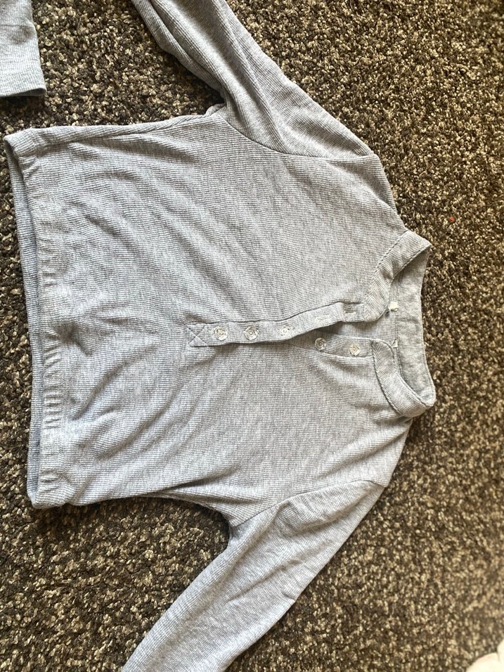Gri renkte, düğmeli ön kısmı ve yakalı tasarımıyla uzun kollu, rahat kesim kadın kazağı. Yumuşak keten kumaştan, günlük kullanıma uygun.