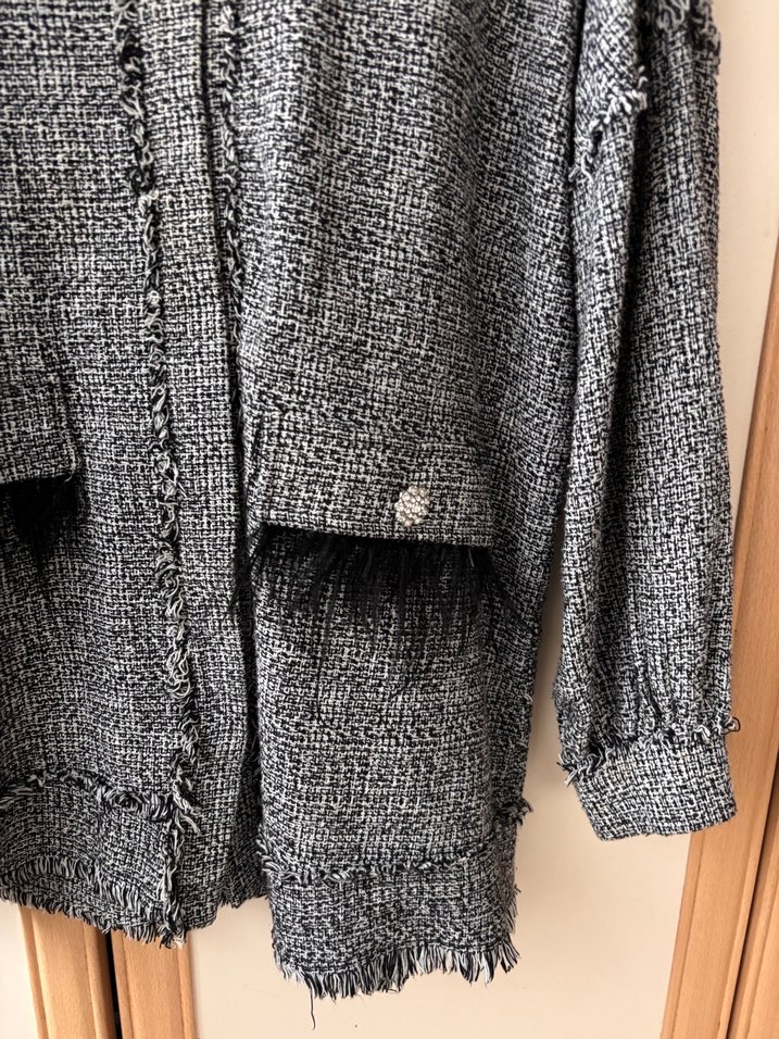 Gri keten kumaştan, düğmeli ve uzun kollu, rahat kesim midi uzunlukta kadın ceket. Notlu yaka detayı ve salaş tarzıyla günlük kullanıma uygun.