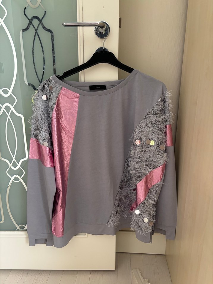 Gri, uzun kollu, düğmeli ve kısa kesim kadın sweatshirtü. Pembe ve gri işlemeli dokulu parçalarla avant-garde sokak stili sunar.