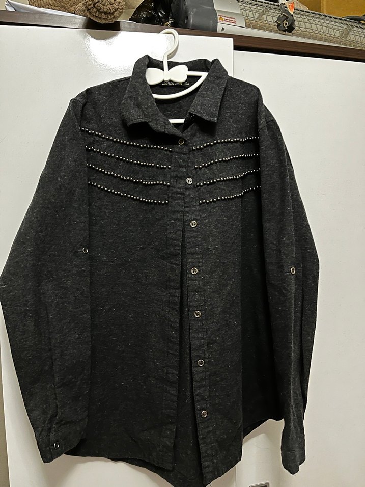 Gri keten kumaştan, düğmeli uzun kollu gömlek. Notched lapel yaka ve gevşek kesim ile midi boyda, günlük kullanıma uygun. Göğüste dekoratif çizgiler bulunur.