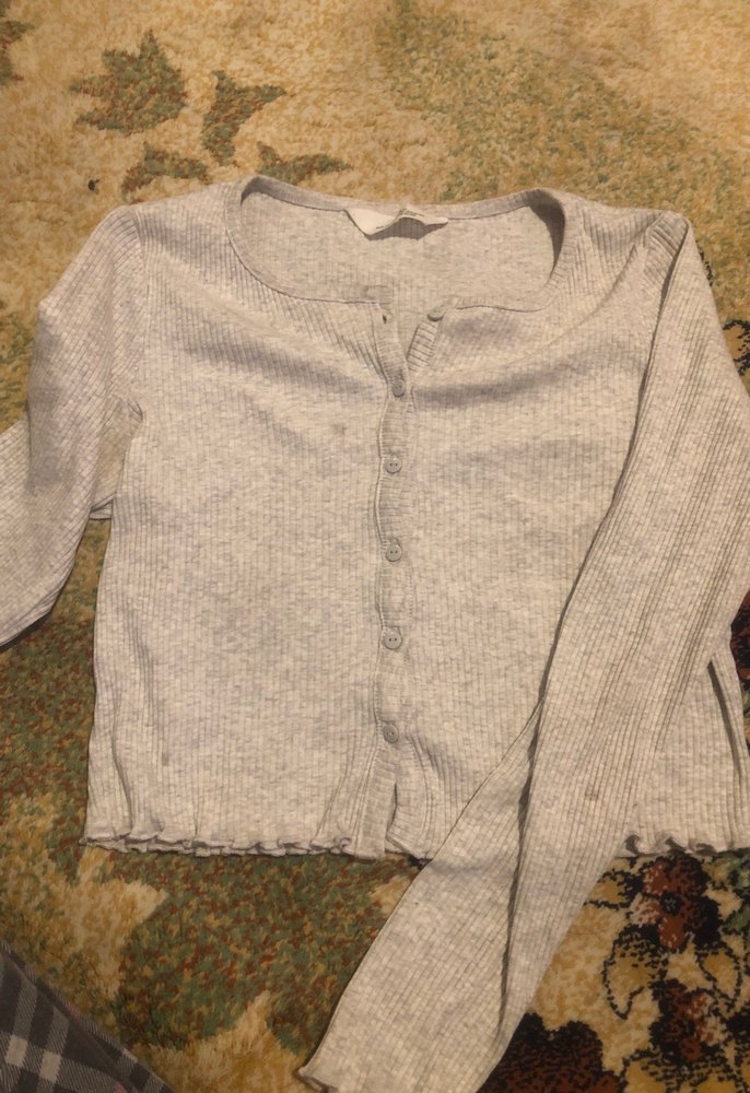 Gri renkli, düğmeli, uzun kollu, bol kesim örme kız hırkası. Desensiz ve sade stil sunar. Lekesi var