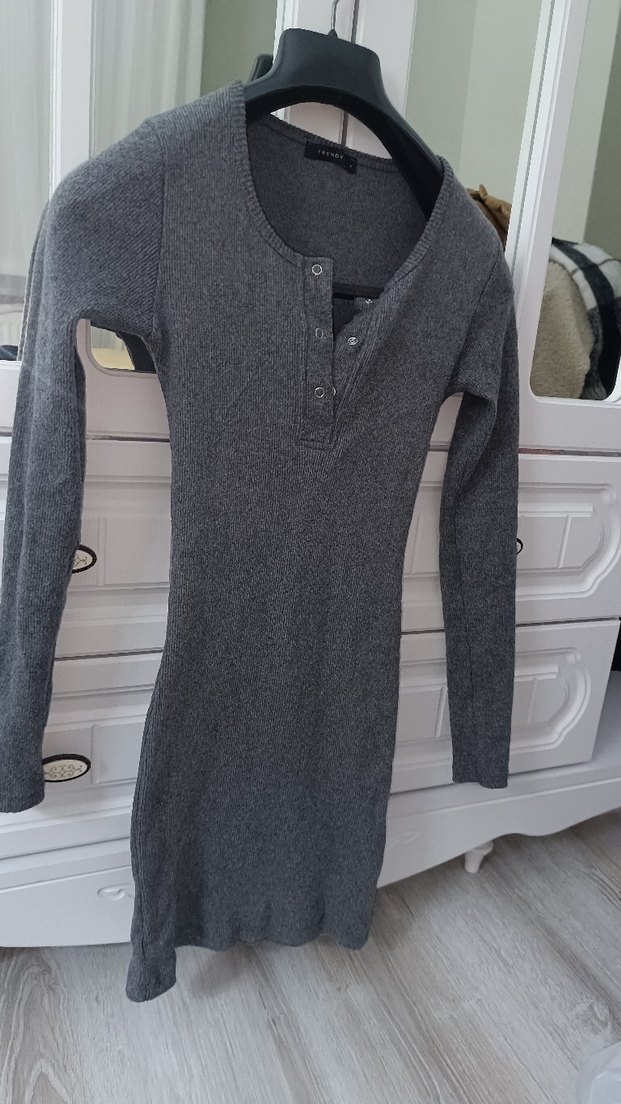 Gri renkli, düğmeli ve uzun kollu, triko kumaştan yapılmış, midi boyda ve vücuda oturan elbise. Rahat ve şık sokak stili için uygundur.