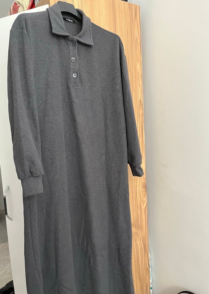 Gri renkli, düğmeli önü ve yakalı uzun kollu triko elbise. Rahat kesimi ve yumuşak sıcak kumaşıyla günlük kullanıma uygun.