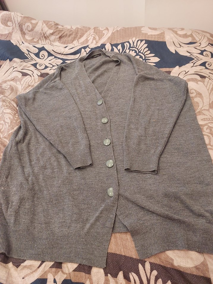 Gri triko hırka, düğmeli ve V yaka detaylıdır. Rahat kesimi ve midi boyu ile günlük kullanıma uygundur. Tuylenme mevcuttur