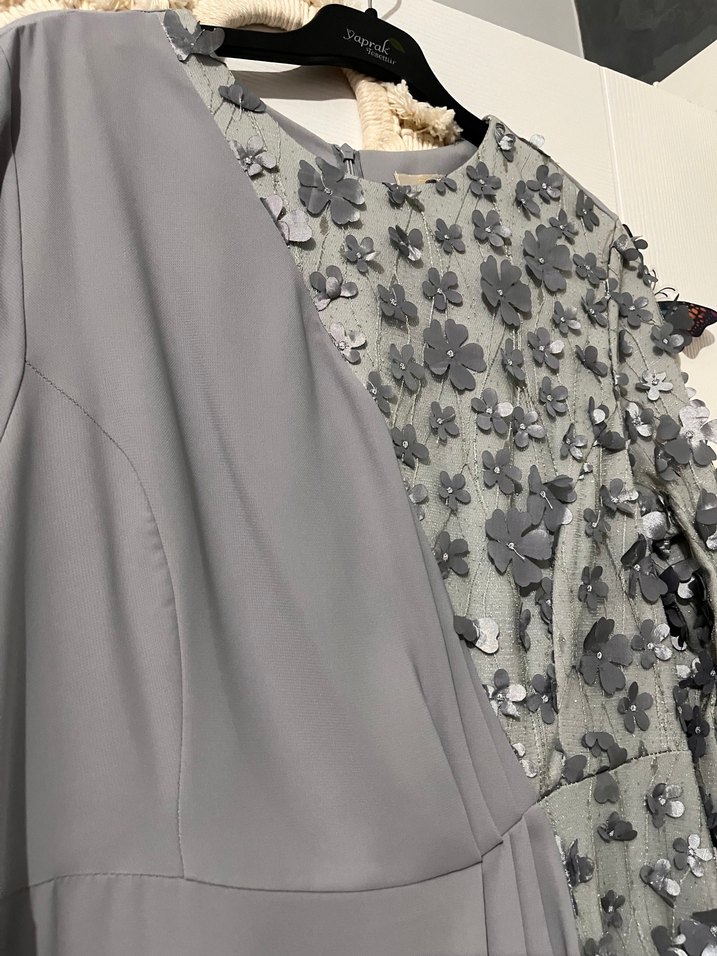 Gri renkli, uzun ve düğmeli kadın elbisesi, nakışlı çiçek desenleri ve yuvarlak yaka ile modern klasik ve avant-garde tarzını yansıtır. Uzun kollu ve bol kesimdir.