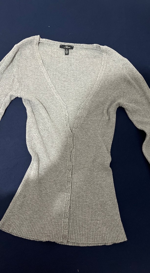 Gri, düğmeli, V yaka, uzun kollu, fitted kesim kadın hırka. Yumuşak kumaştan, günlük kullanıma uygun sade ve rahat bir model.