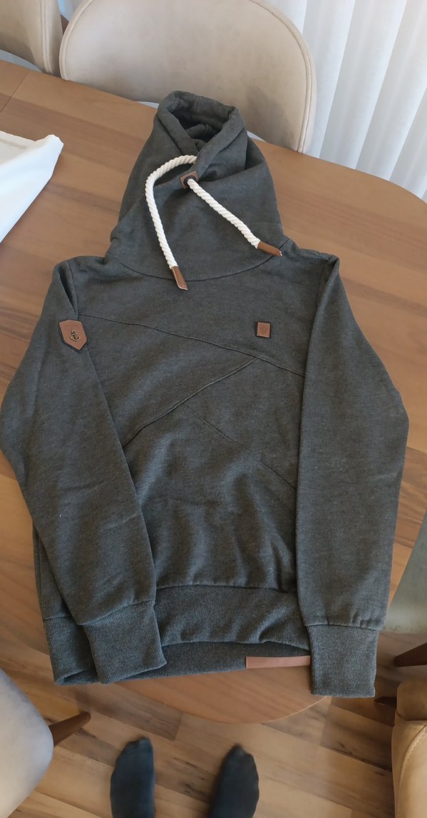 Düğmeli yüksek yakalı, bol kesim gri erkek sweatshirtü. Yumuşak ve sıcak kumaştan, uzun kollu ve normal boyda, rahat.
