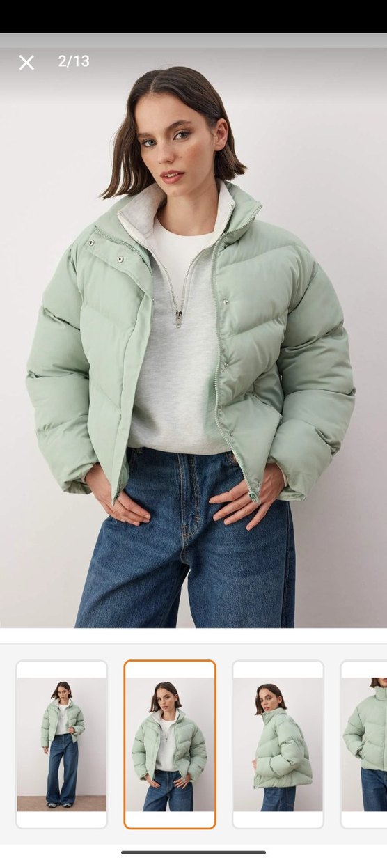 Pastel gri renkli, yüksek yakalı ve düğmeli ön kısmı olan ceket. Bol kesim ve uzun kollu, yumuşak ve sıcak dokulu, günlük rahat stil için uygundur.