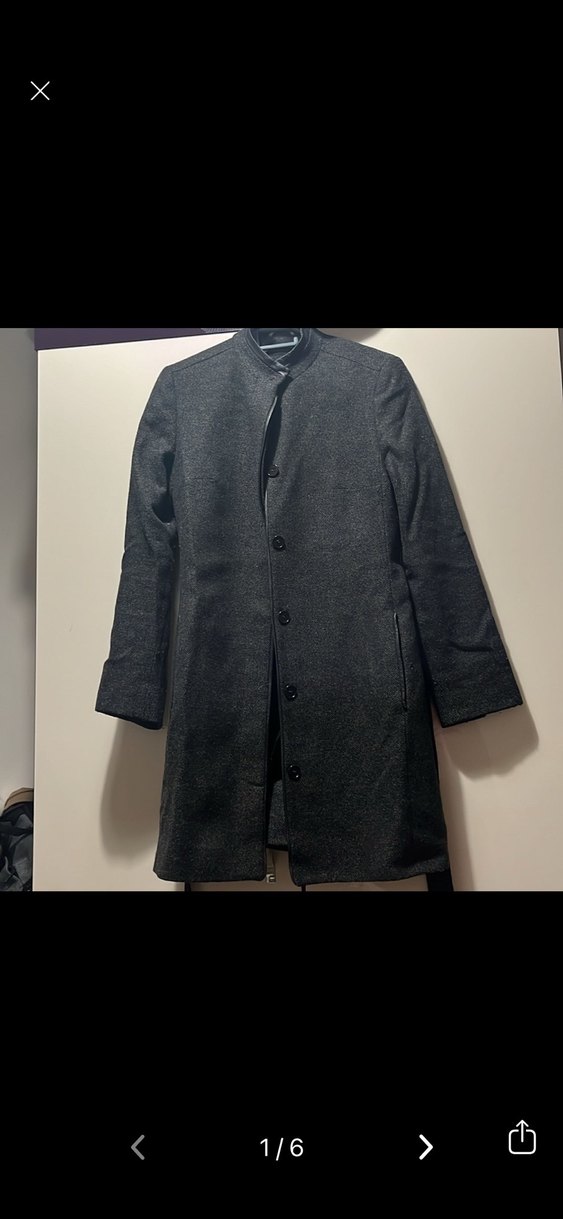 Gri yün kaban, düğmeli ve kırlangıç yaka detaylıdır. Normal kesim, uzun kollu ve midi boyda, ofis için uygun minimalist tarzda bir üründür.