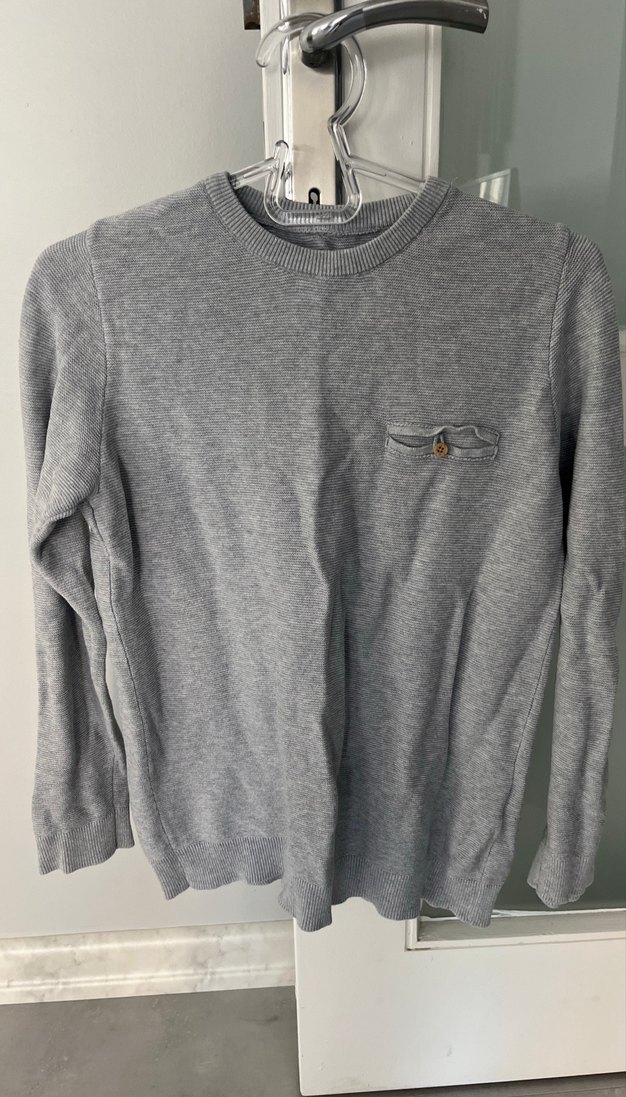 Gri renkli, uzun kollu, yuvarlak yaka, düğmeli cep detaylı, bol kesim erkek çocuk kazak. Günlük rahat sokak stili için uygundur.