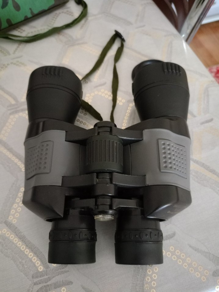 Ayarlanabilir odaklama ve dokulu tutma yerlerine sahip gri dürbün. Kolay taşınması için yeşil askı ile birlikte gelir.
