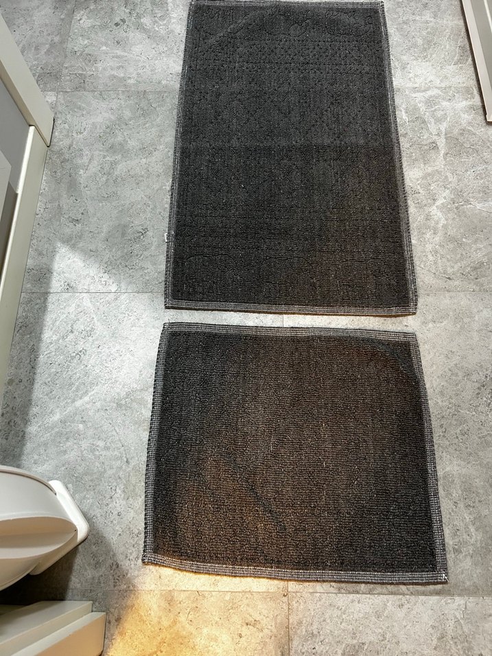Düz desenli, gri renkte iki adet banyo paspası seti, banyo zeminleri için uygundur.
