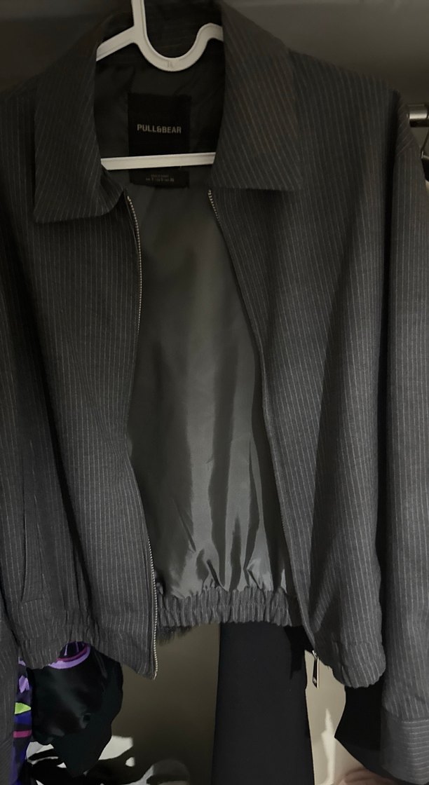 Düz gri, sentetik kumaştan kadın midi ceketi, normal kesim, uzun kollu, yakası kesik ve fermuarlı. Ofis ve günlük kullanım için uygundur. PULL&BEAR markalı.
