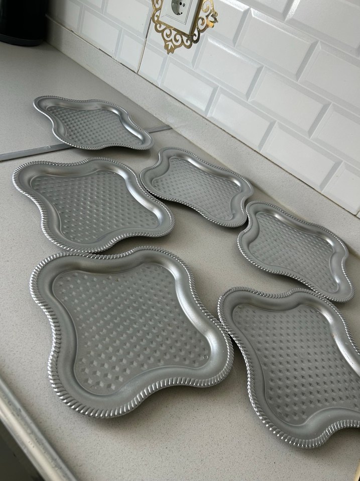 Altı adet gri, sunum tepsisi plastiktir 6 adetir