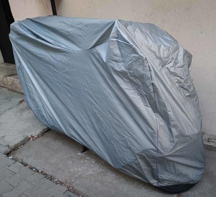 Gri renkli motorsiklet örtüsü, su geçirmez malzemeden üretilmiş olup toz ve hava koşullarına karşı tam koruma sağlar. Ayarlanabilir kayışları ve saklama çantası mevcuttur. ️