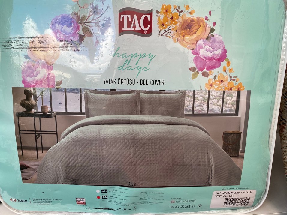 Taç markasına ait gri, düz desenli ve yumuşak dokulu yatak örtüsü. Çift kişilik kutulu hiç kullanılmamıstır