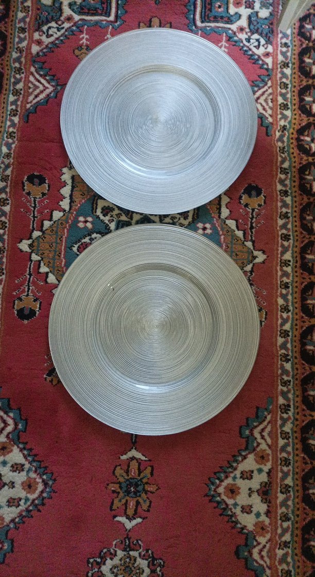 Gri renkte, düz desensiz ve klasik tarzda iki yuvarlak tabak. Yüzeylerinde hafif dairesel doku bulunur. ️