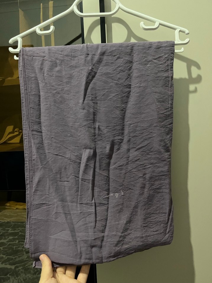 Lila renkli parlak şal Üzerinde yapıştırıcı ? Lekesi var ama boyun kısmına gelirse kullanırken görünmez
